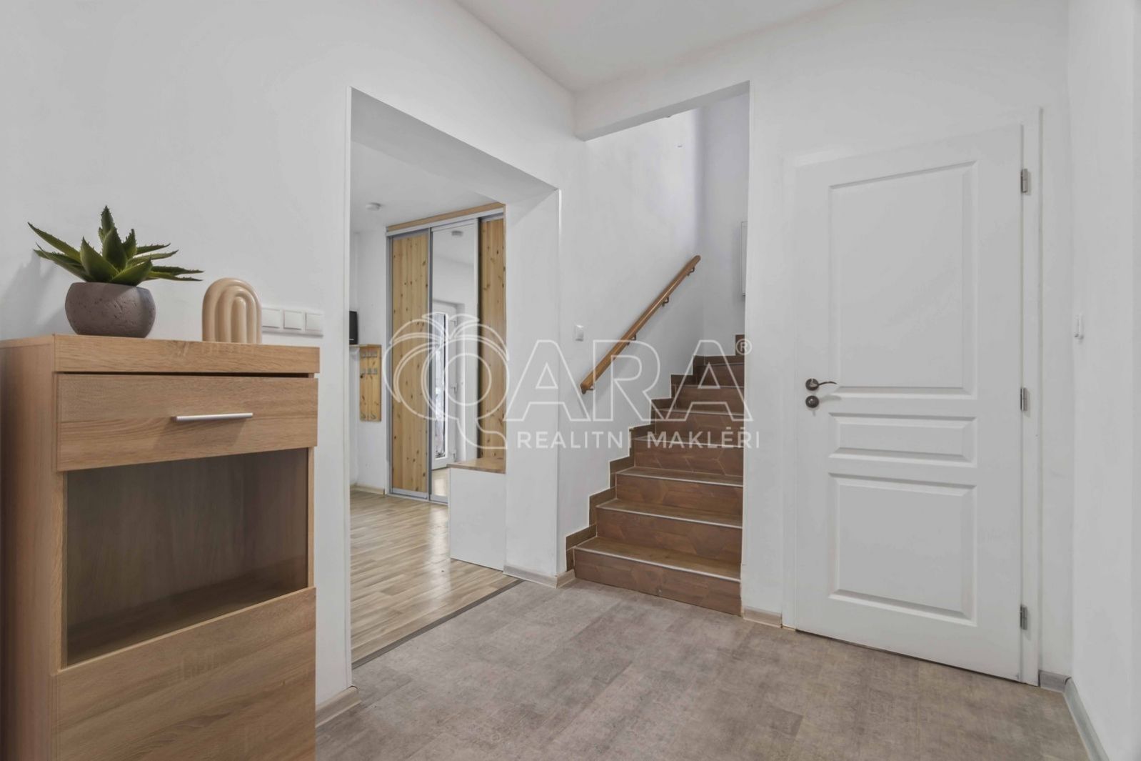 První nadzemní podlaží tvoří předsíň se šatnou (10 m2), prostorný obývací pokoj s kuchyňským koutem (cca 41 m2), koupelna s vanou (3 m2) a samostatná toaleta (1,3 m2). Moderní kuchyňská linka je vybavena vestavnými spotřebiči.