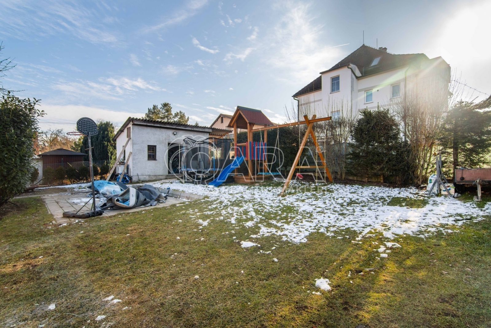 Dům se nachází na rovinatém a oploceném pozemku o výměře 671 m2 (včetně zastavěné plochy a nádvoří). Na pozemku je dále zděná garáž (23 m2 zastavěné plochy), zděný zahradní domek (16 m2 zastavěné plochy) a zahradní nádrž (6 m3) s přípravou na závlahový systém.