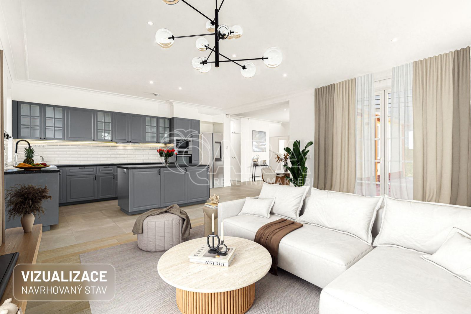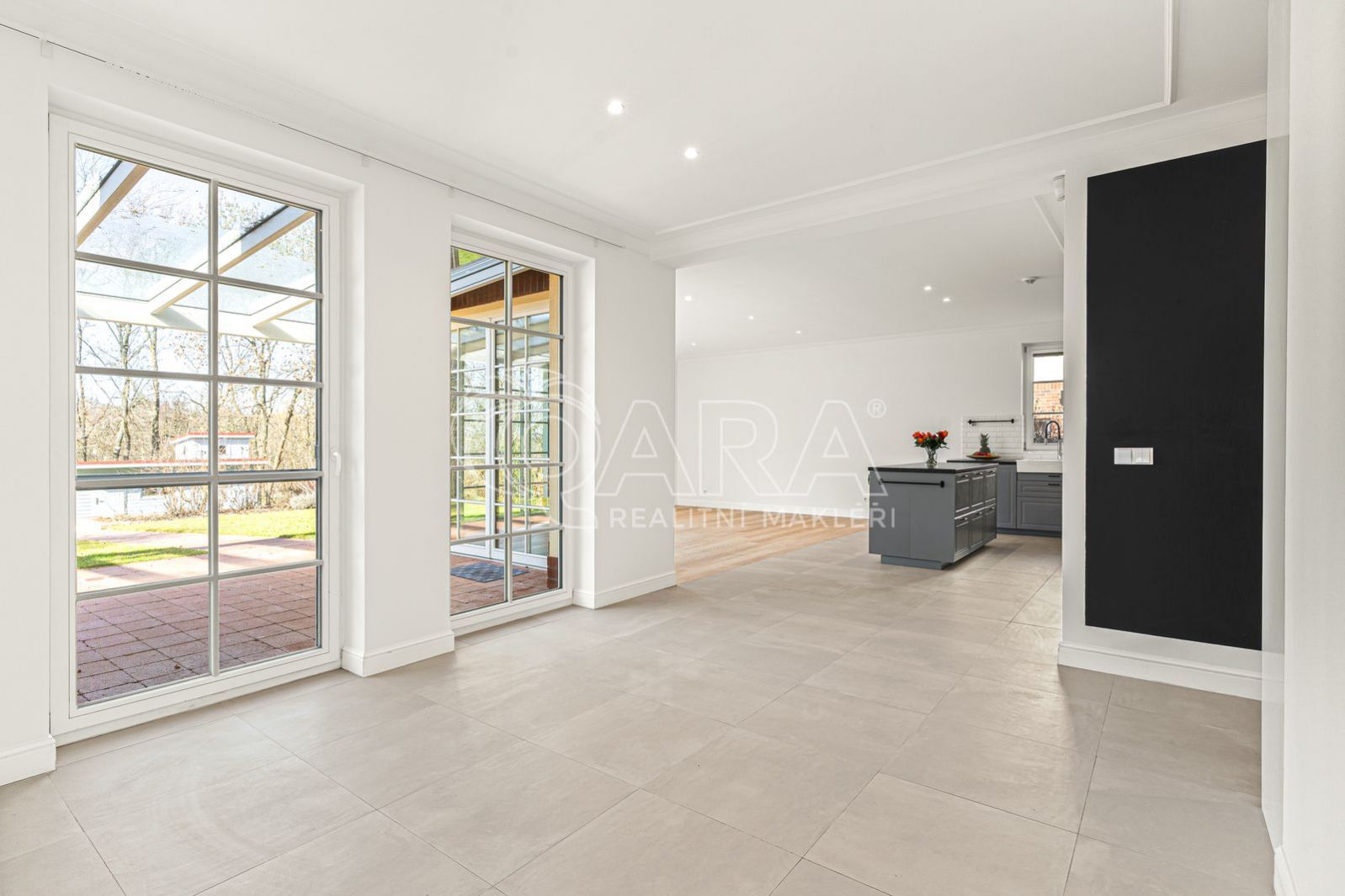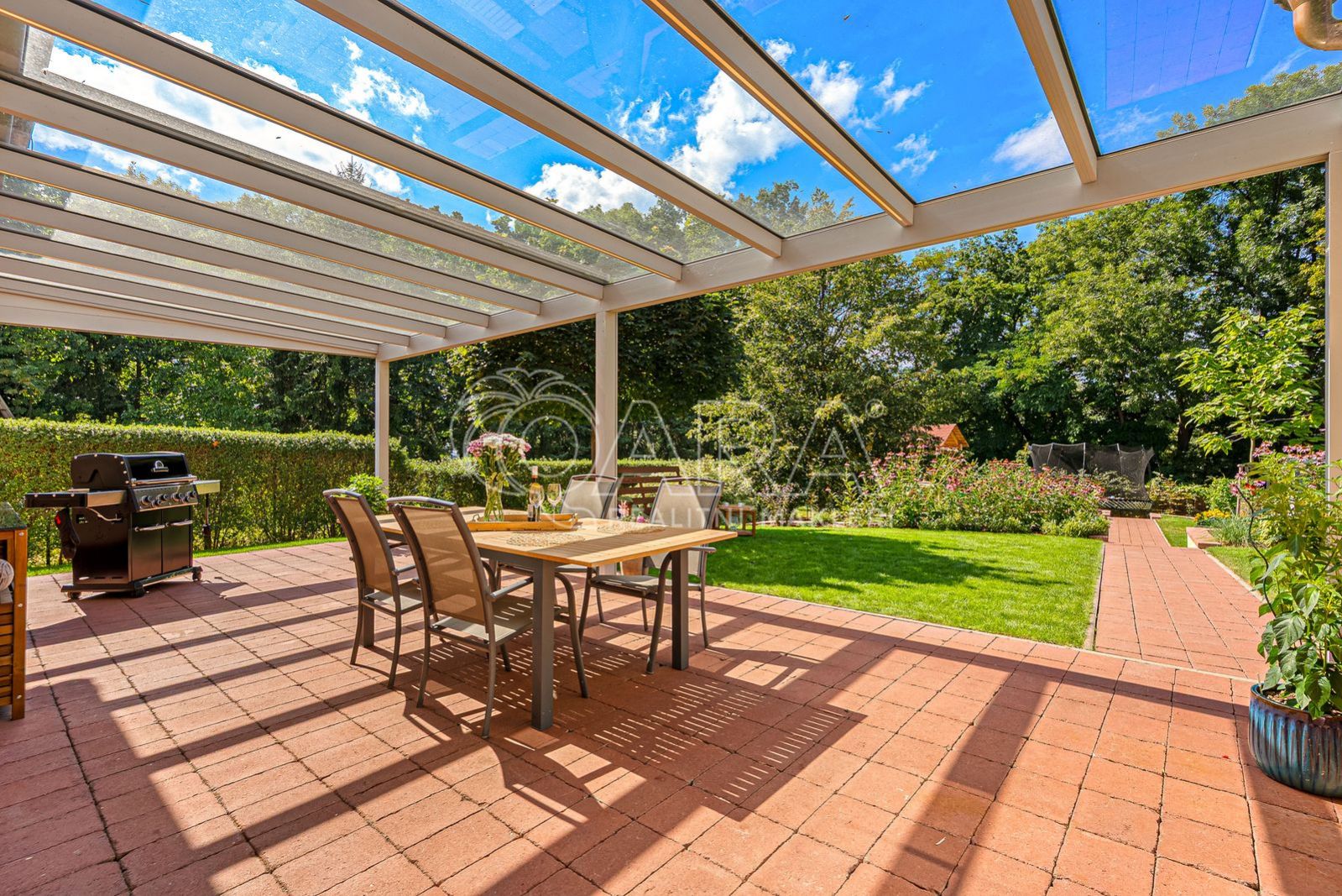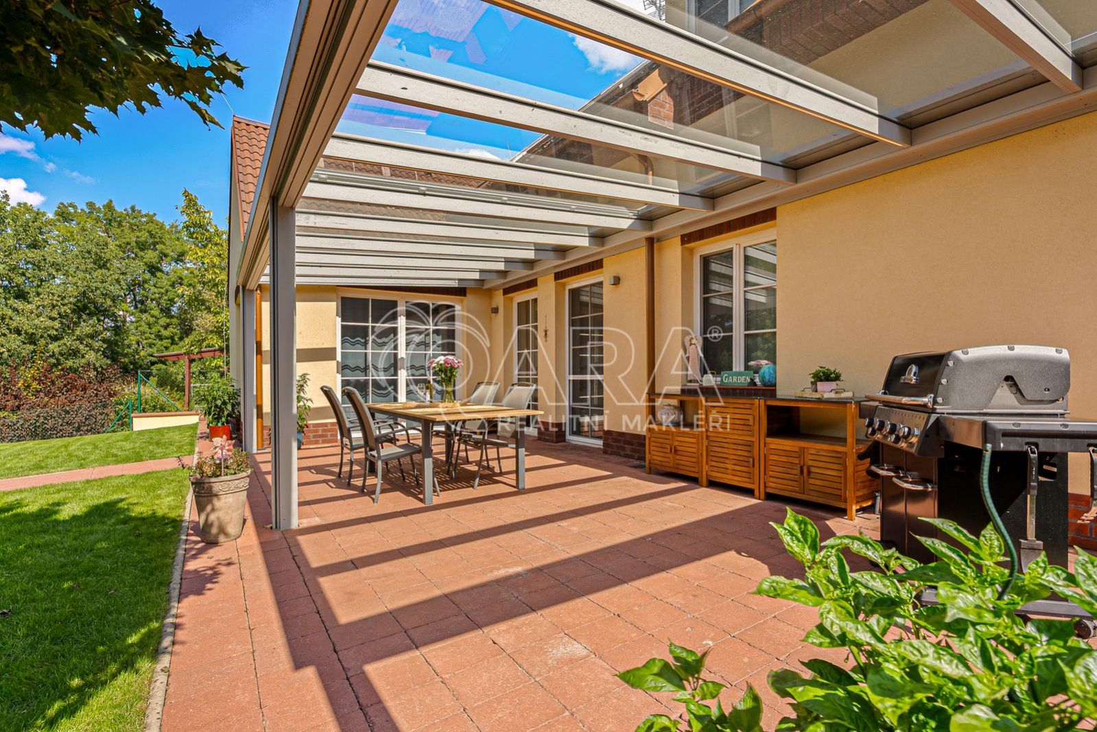 Z obývací části je přímý vstup na terasu s pergolou, která nabízí ideální prostor pro odpočinek i setkání s rodinou a přáteli.