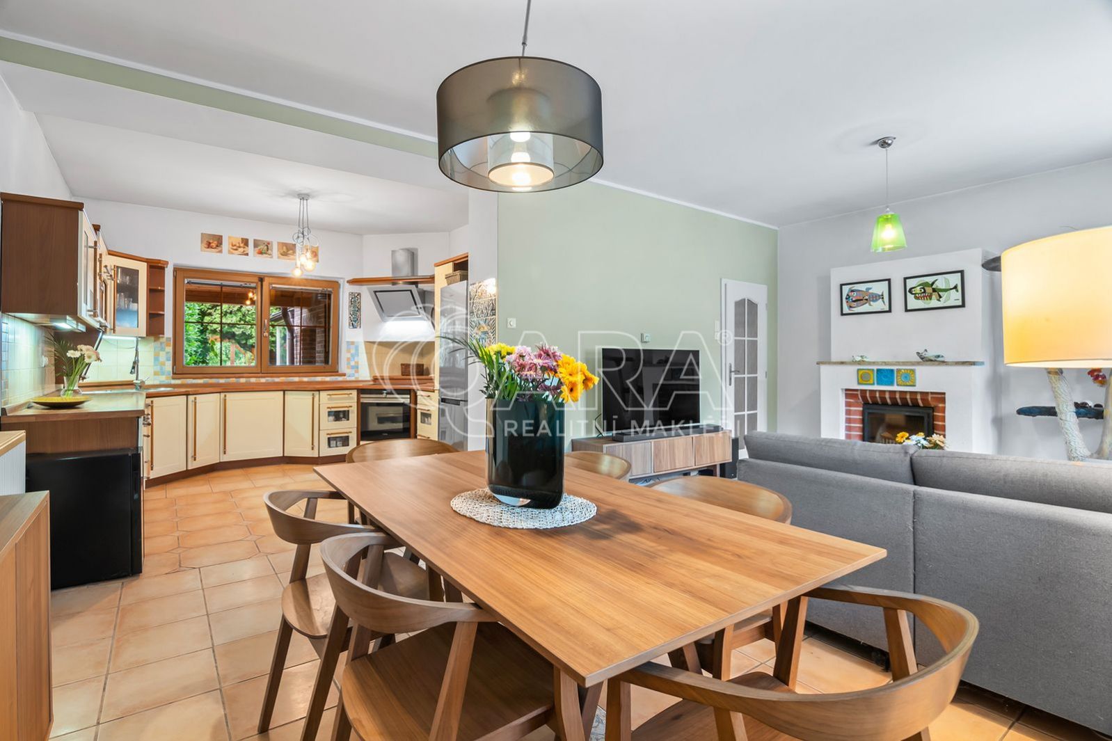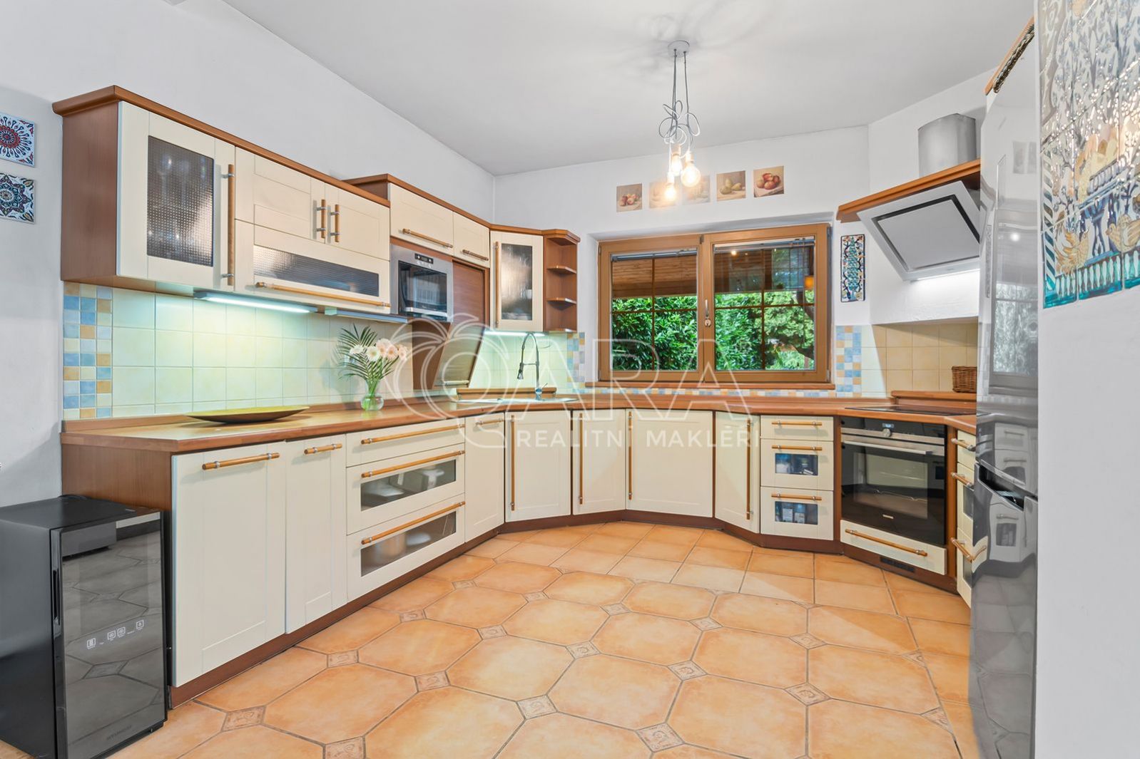 V přízemí domu najdete velký obývací pokoj s kuchyňským koutem, který je kompletně vybavený spotřebiči (horkovzdušná i mikrovlnná trouba, lednice, myčka, varná deska i odsavač par). Dále v přízemí domu najdete velkou obytnou halu, toaletu, koupelnu se sprchovým koutem a dalším toaletou a bidetem, a zimní zahradu. Je zde také velká ložnice vybavená klimatizací, elektricky ovládanými střešními okny a přístupem do domácího wellness centra.
